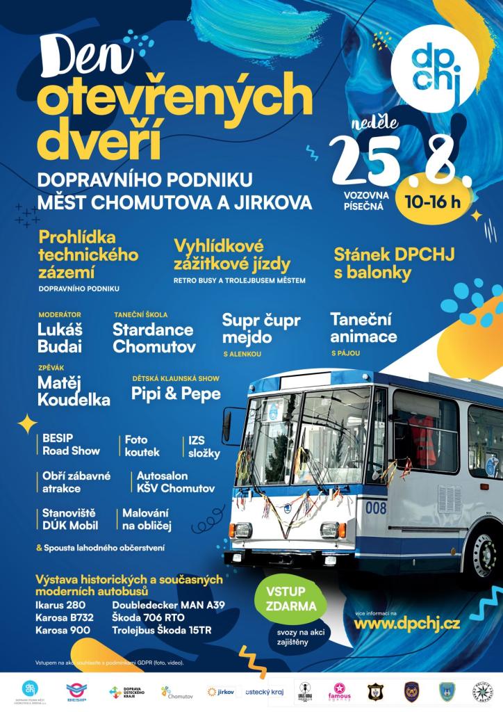 Dopravní podnik měst Chomutova a Jirkova otevře brány vozovny Písečná pro širokou veřejnost v neděli 25. srpna 2024. Uskuteční se 6. ročník Dne otevřených dveří. Na letošní akci jsme pro vás připravili několik novinek. Komentované prohlídky vozovny s průvodcem. Na odstavné ploše budou vystaveny autobusy a trolejbusy od nejstarších až po nejnovější. Spolu s novými vozy od Solarisu zde budou vystaveny Karosy řady 700, Ikarus 280, Karosy řady 900, pracovní vůz Škoda 15Tr ev.č. 002, servisní vozidla a další. Připraven bude kvíz dopravního podniku o drobné dárky DPCHJ.