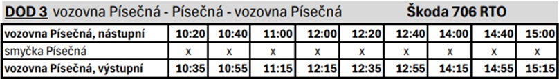 Na linku DOD3 bude vypraven autobus Škoda 706 RTO a pojede jako vyhlídková linka po trase vozovna Písečná – smyčka Písečná – vozovna Písečná.