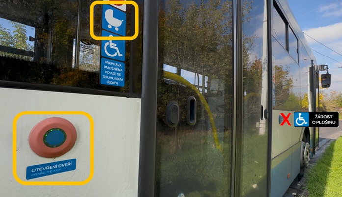 - Před výstupem cestující včas informuje řidiče tlačítkem s piktogramem kočárku.