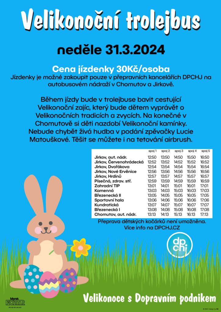 dopravní podnik měst Chomutov a Jirkova a.s. připravil tradiční akci Velikonoční trolejbus pro všechny malé cestující, která se uskuteční v neděli 31. 3. 2024.