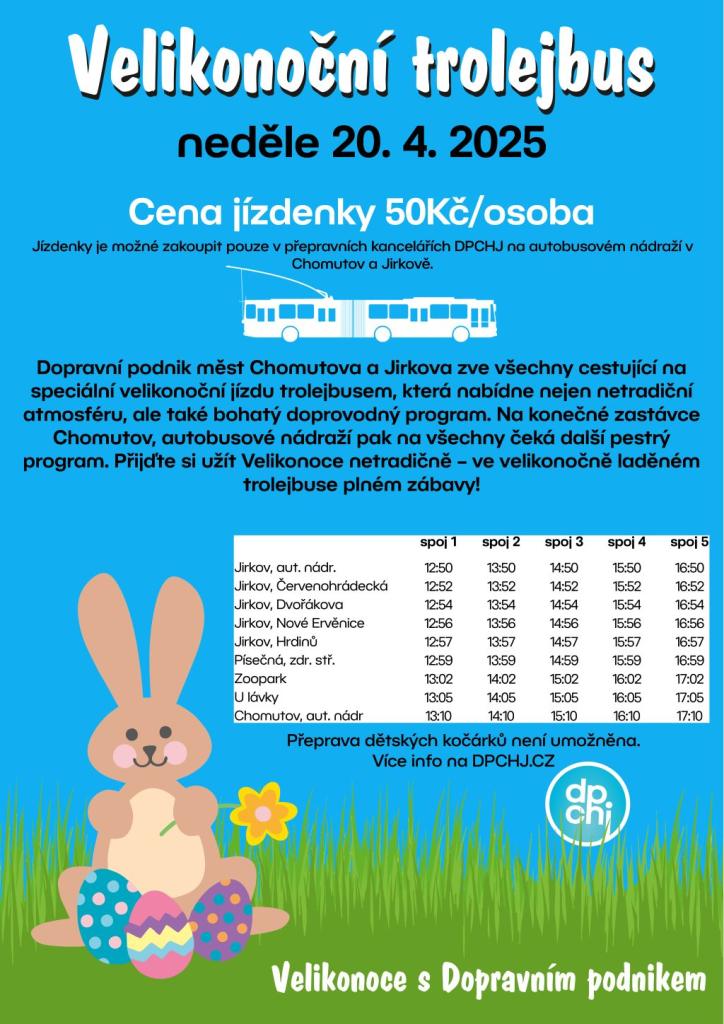 Dopravní podnik měst Chomutova a Jirkova, a.s., pro Vás opět připravil oblíbenou akci Velikonoční trolejbus! Přijďte si v neděli 20. dubna 2025 užít sváteční atmosféru a svézt se naším historickým trolejbusem Škoda 15Tr ev. č. 008 z roku 1995.